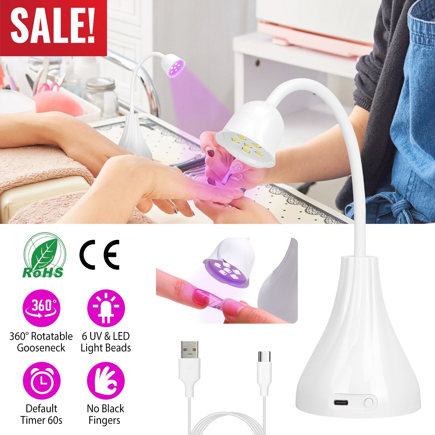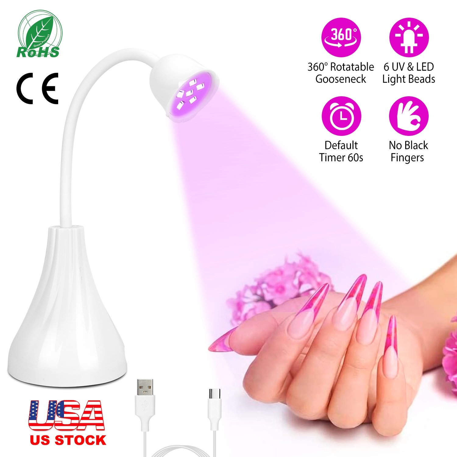 This gooseneck nail lamp is an upgraded nail dryer. 360° Rotatable and fully open-ended operation space design make it easy to DIY nail art design and cure the gel nail polish at the same time, exactly convenient and time-saving. Ideal for both home and salon use to do DIY fingernail and toenails art design.